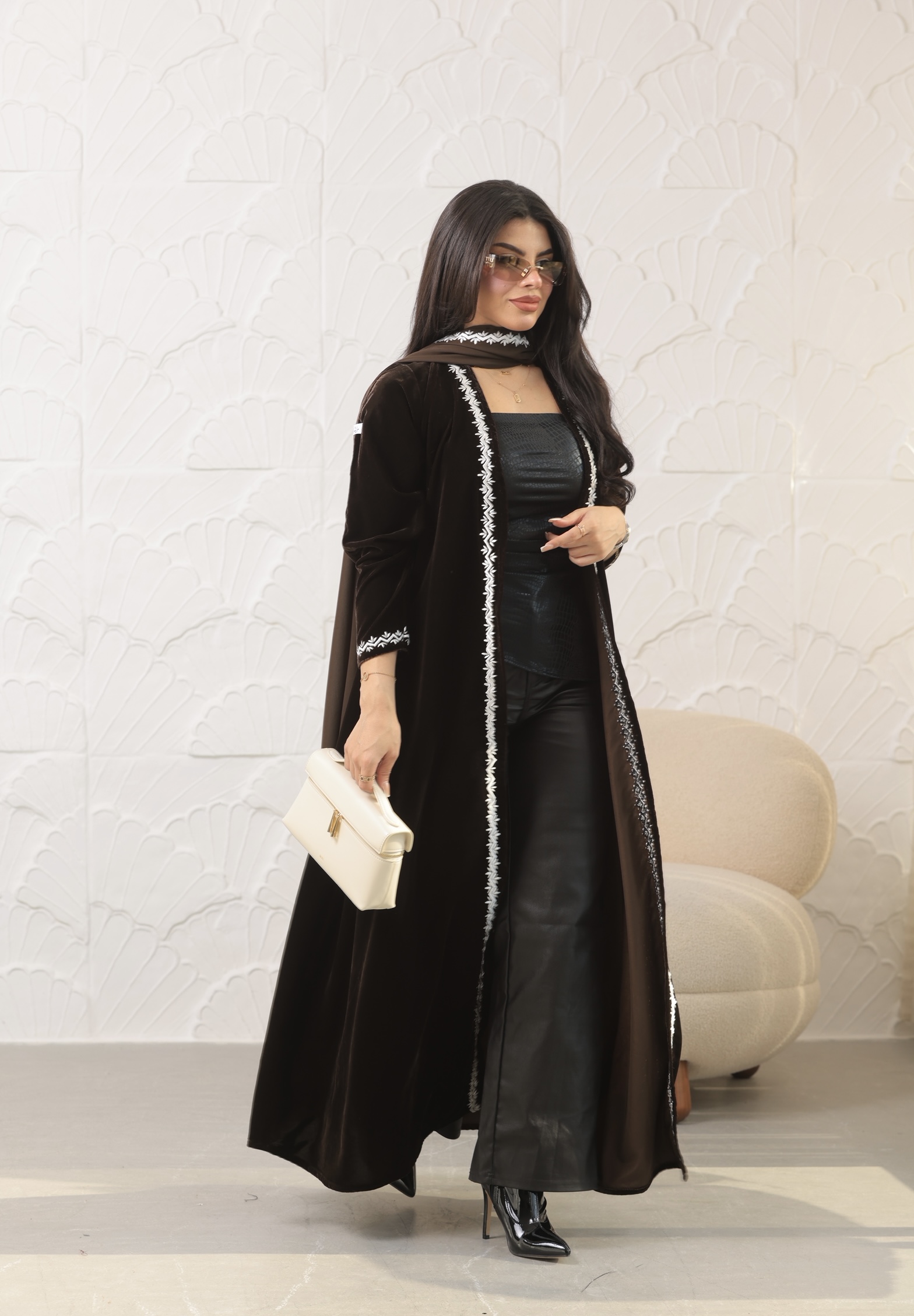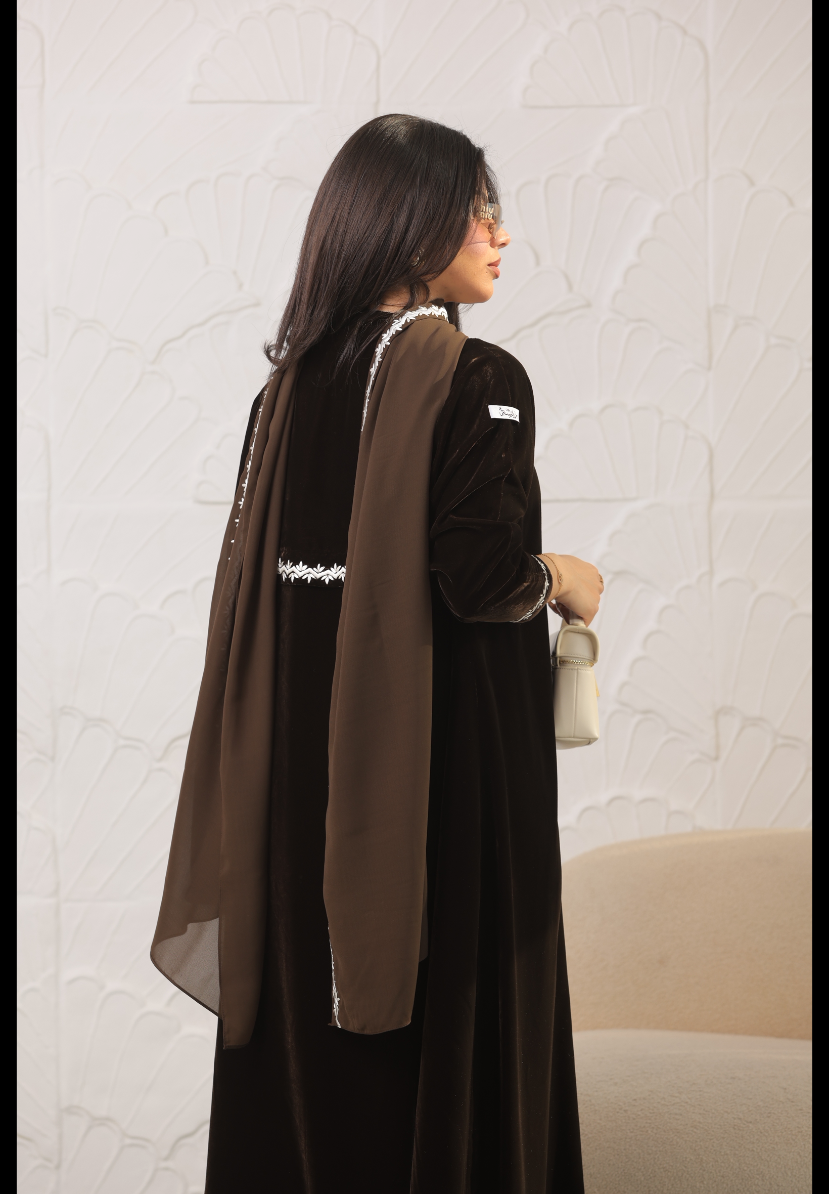 عباية شتوية باللون البني مطرزة في العباية و الطرحة