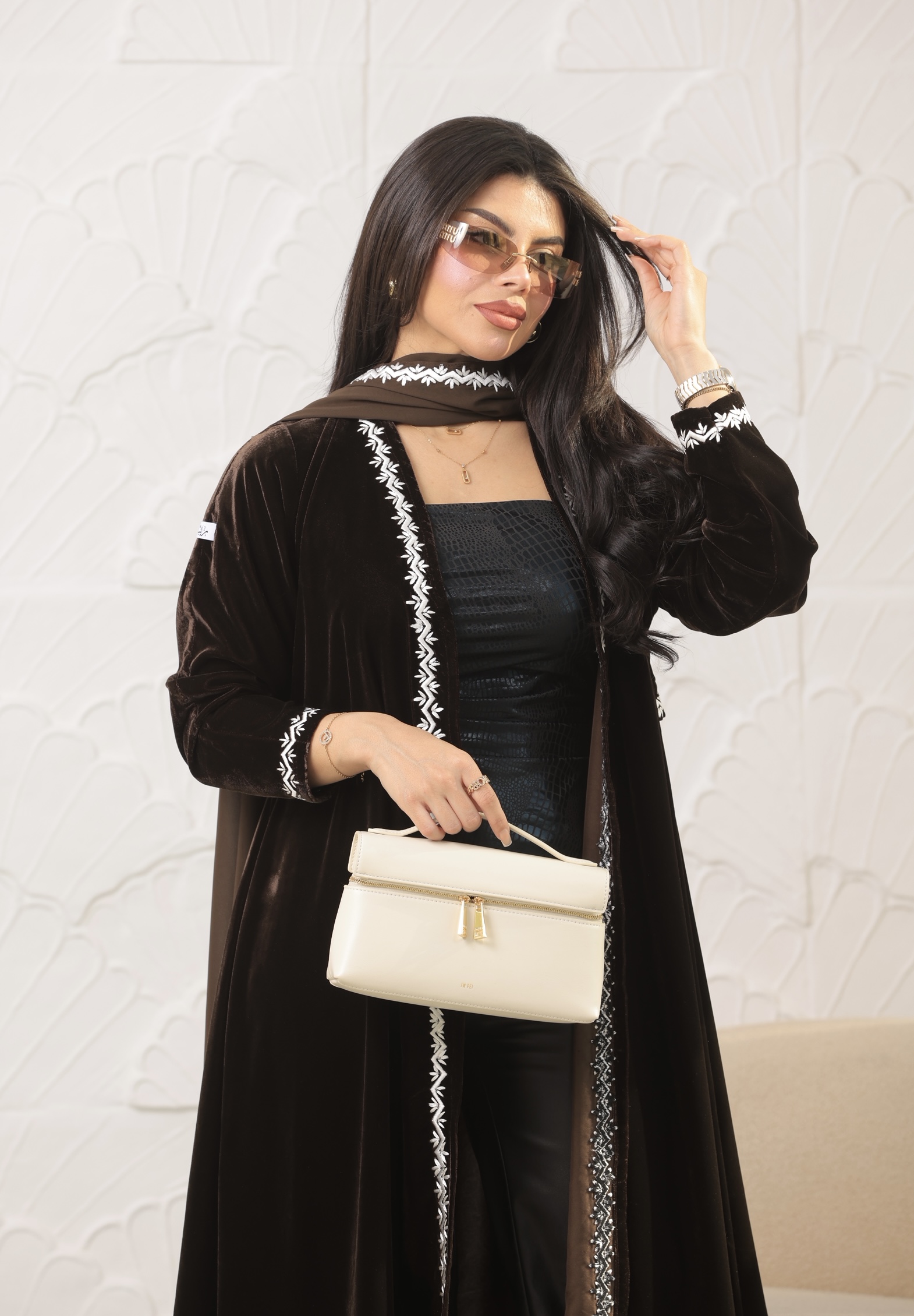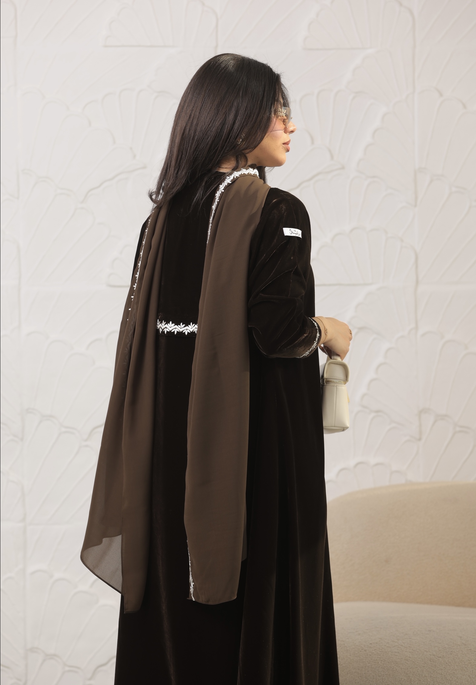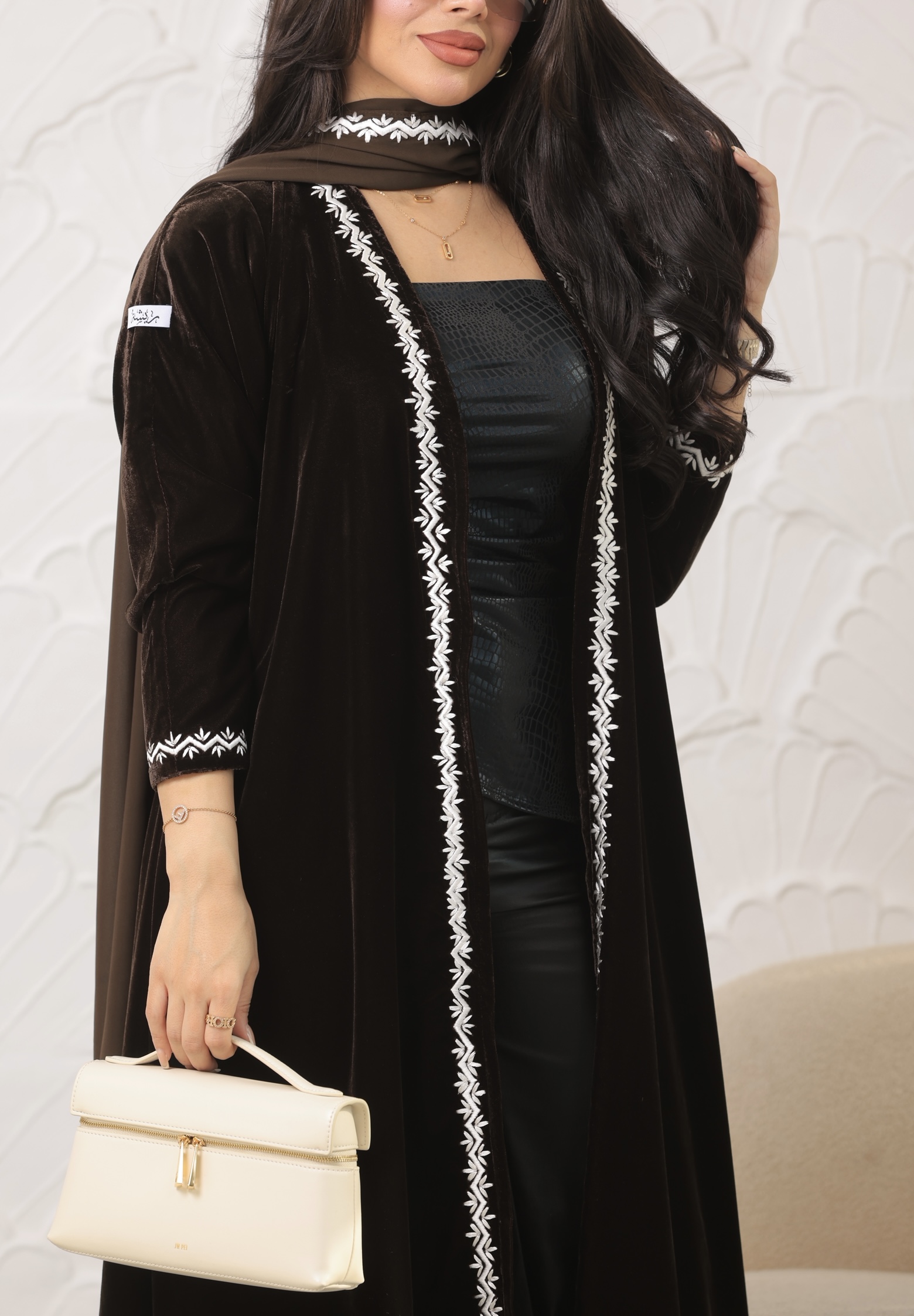 عباية شتوية باللون البني مطرزة في العباية و الطرحة