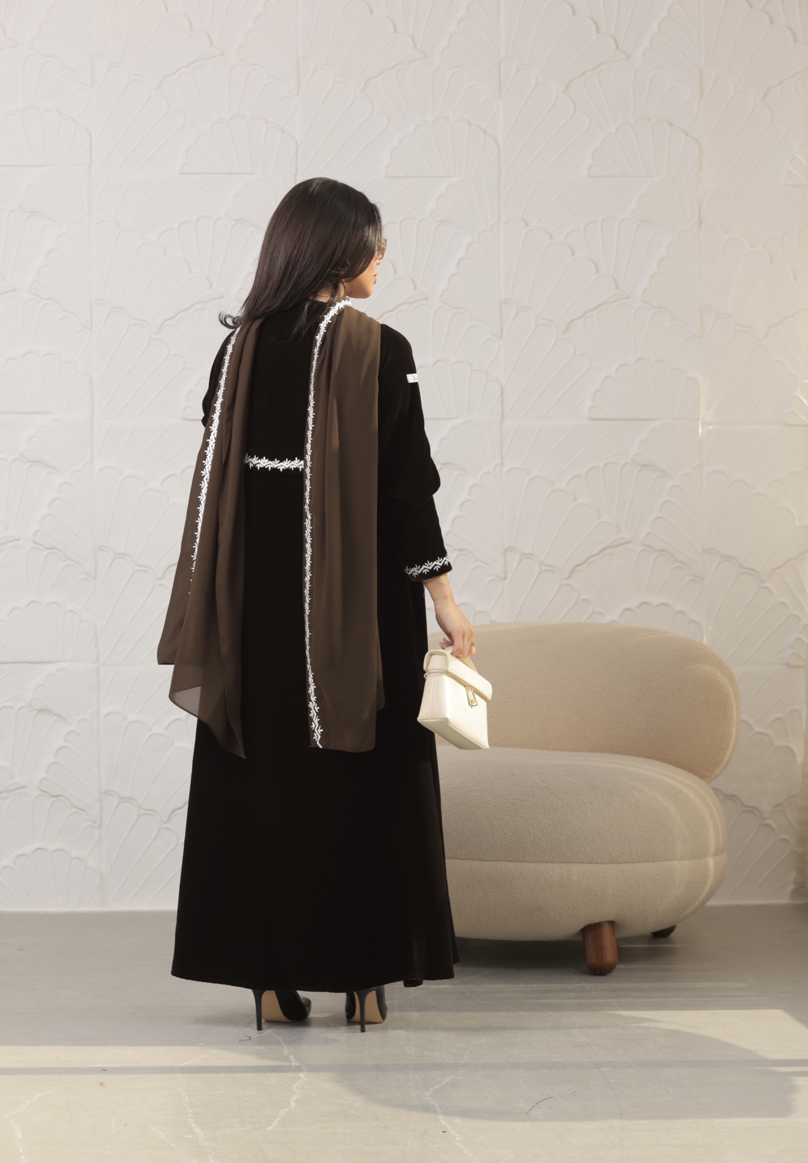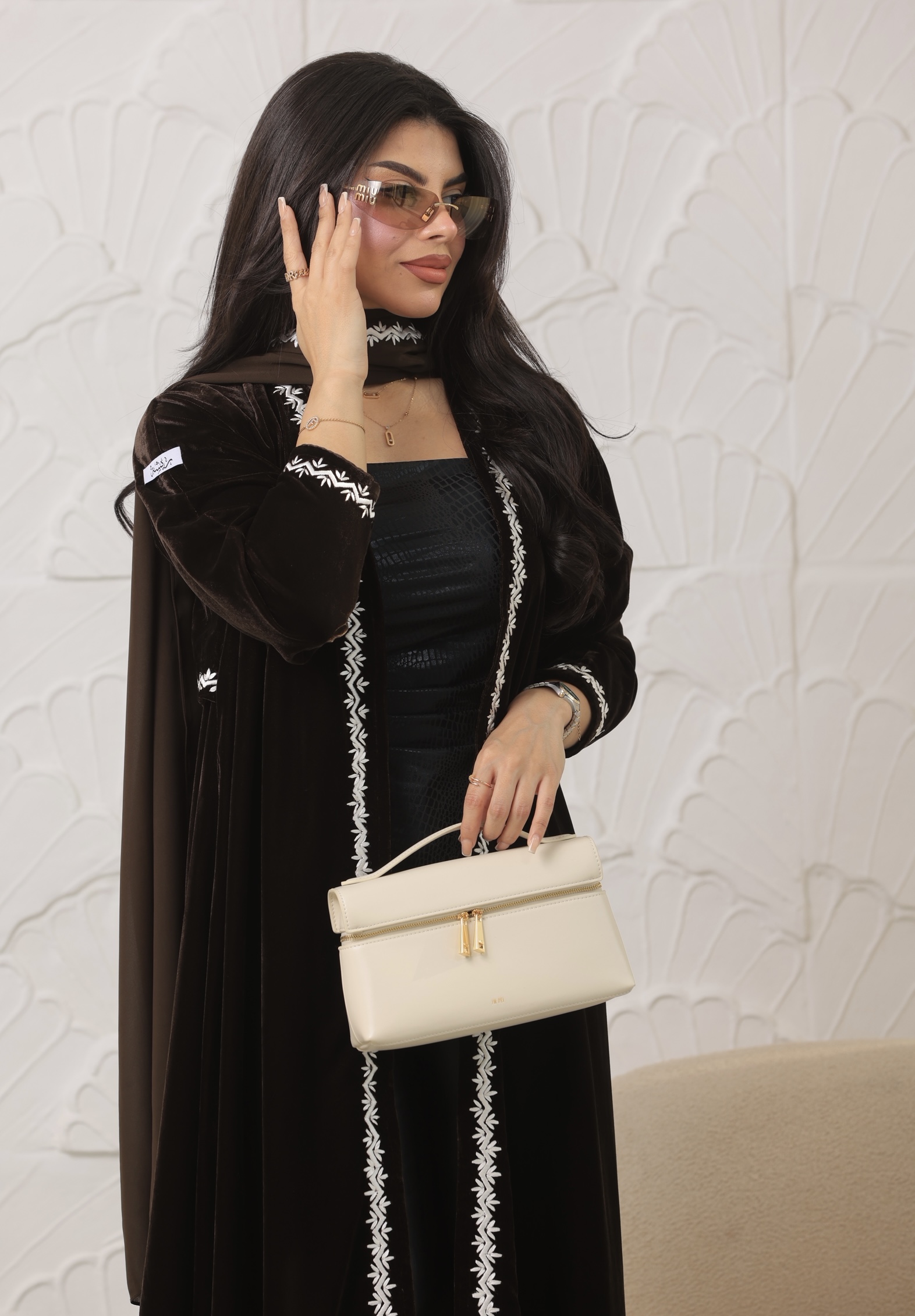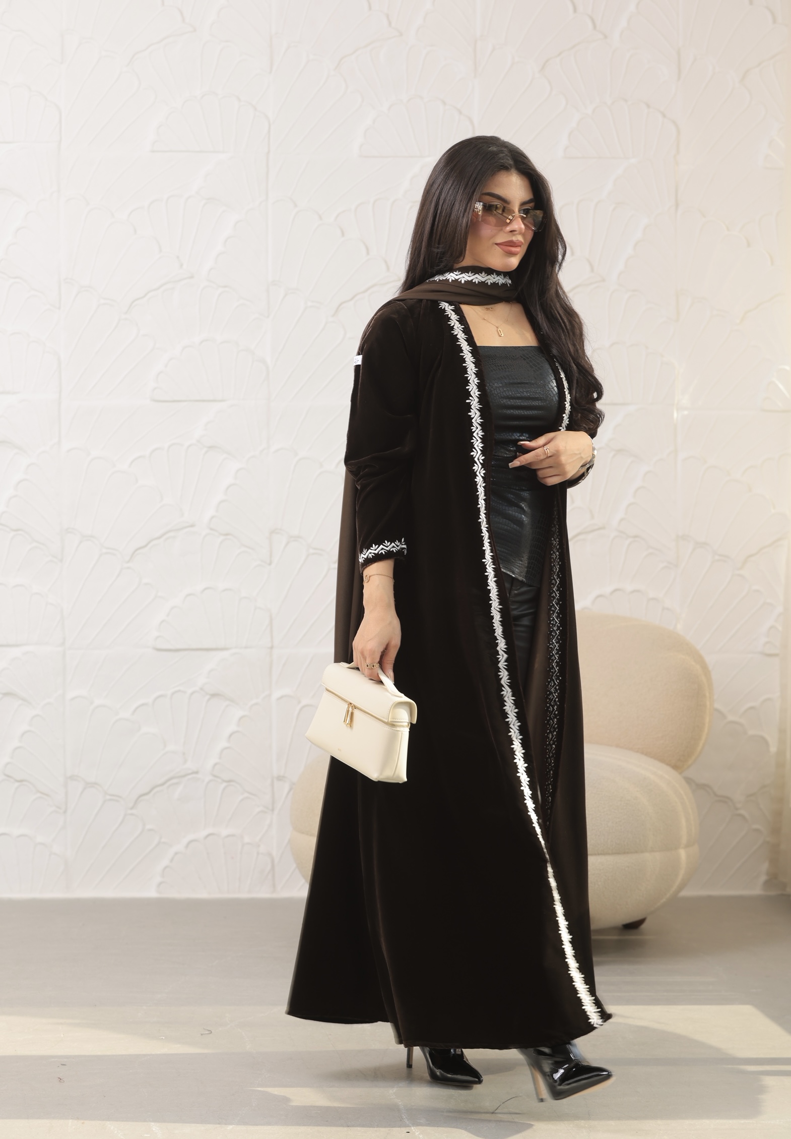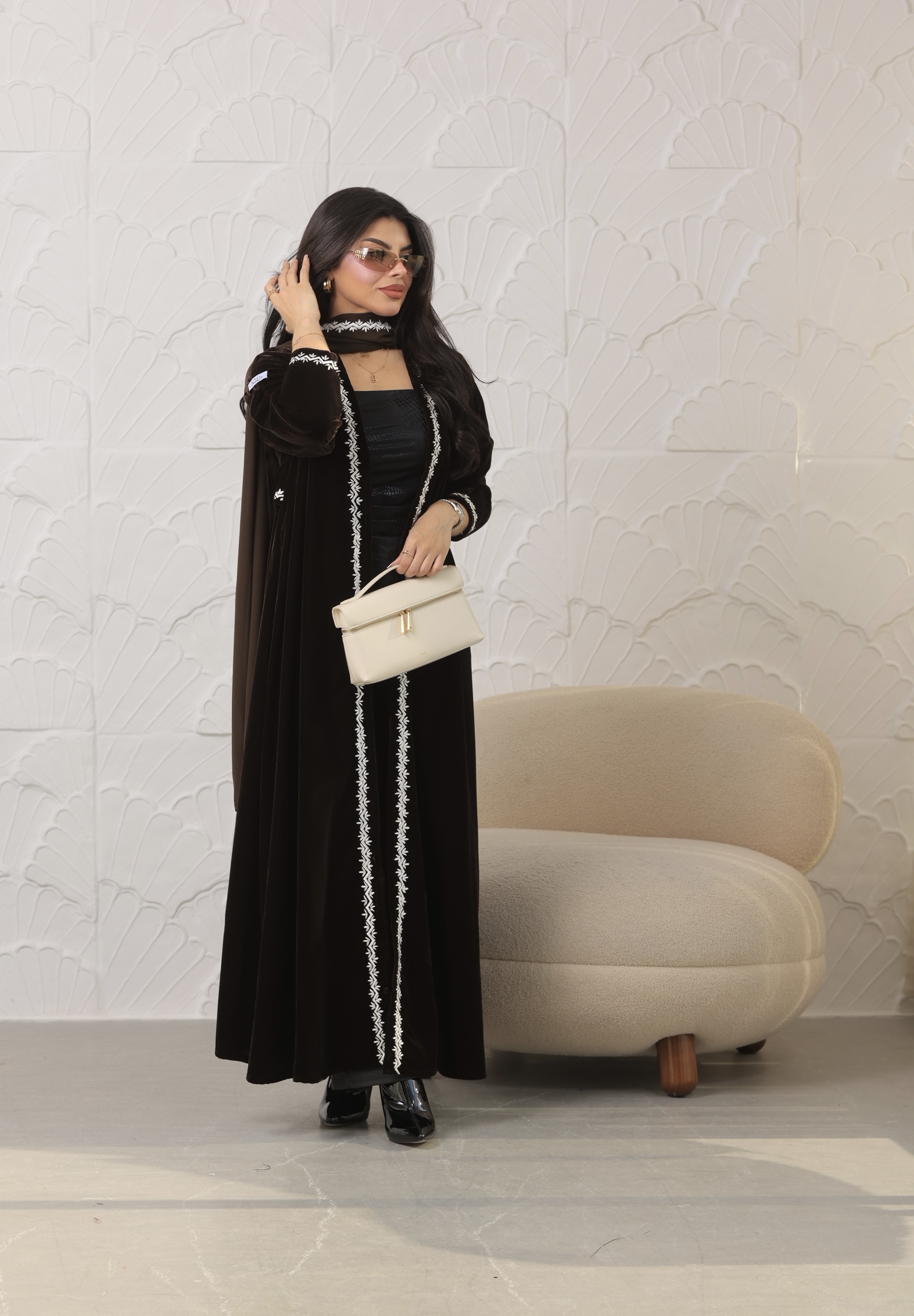 عباية شتوية باللون البني مطرزة في العباية و الطرحة