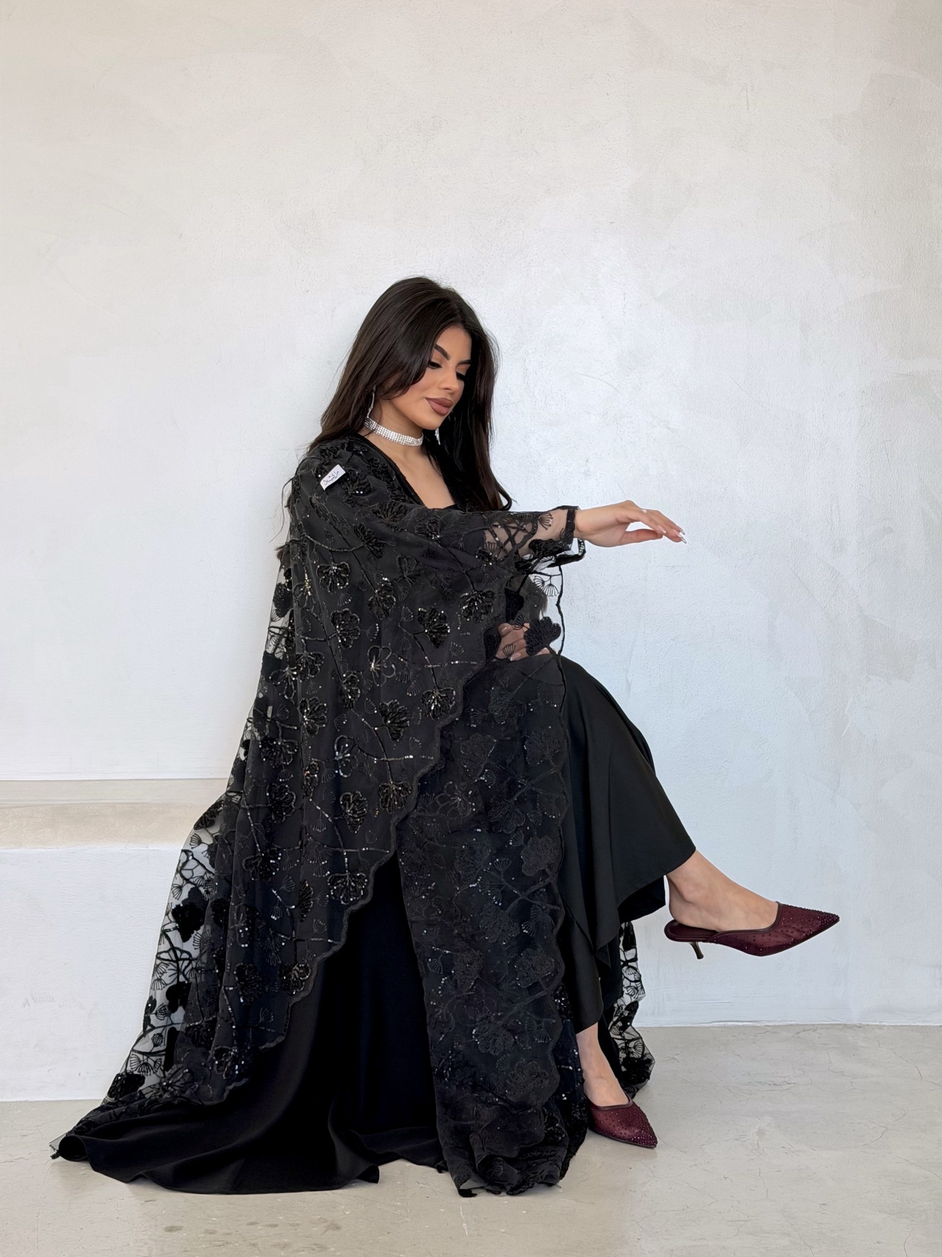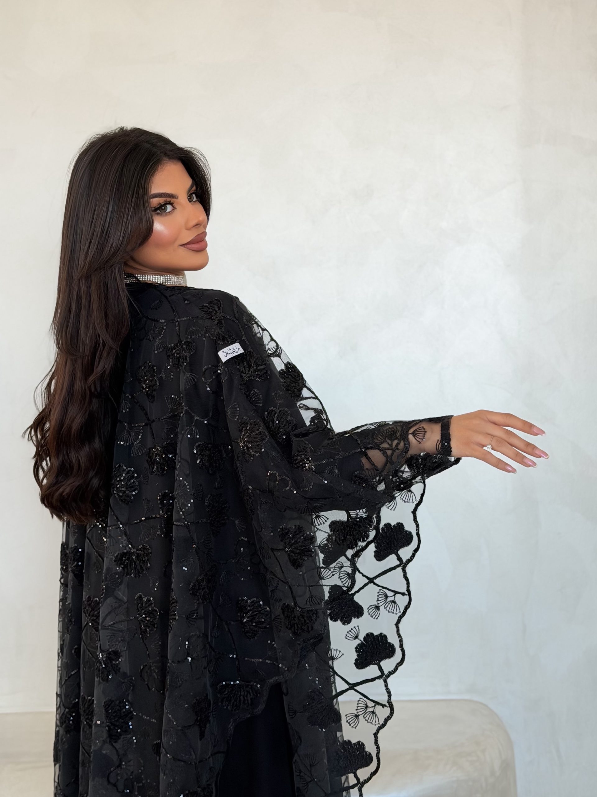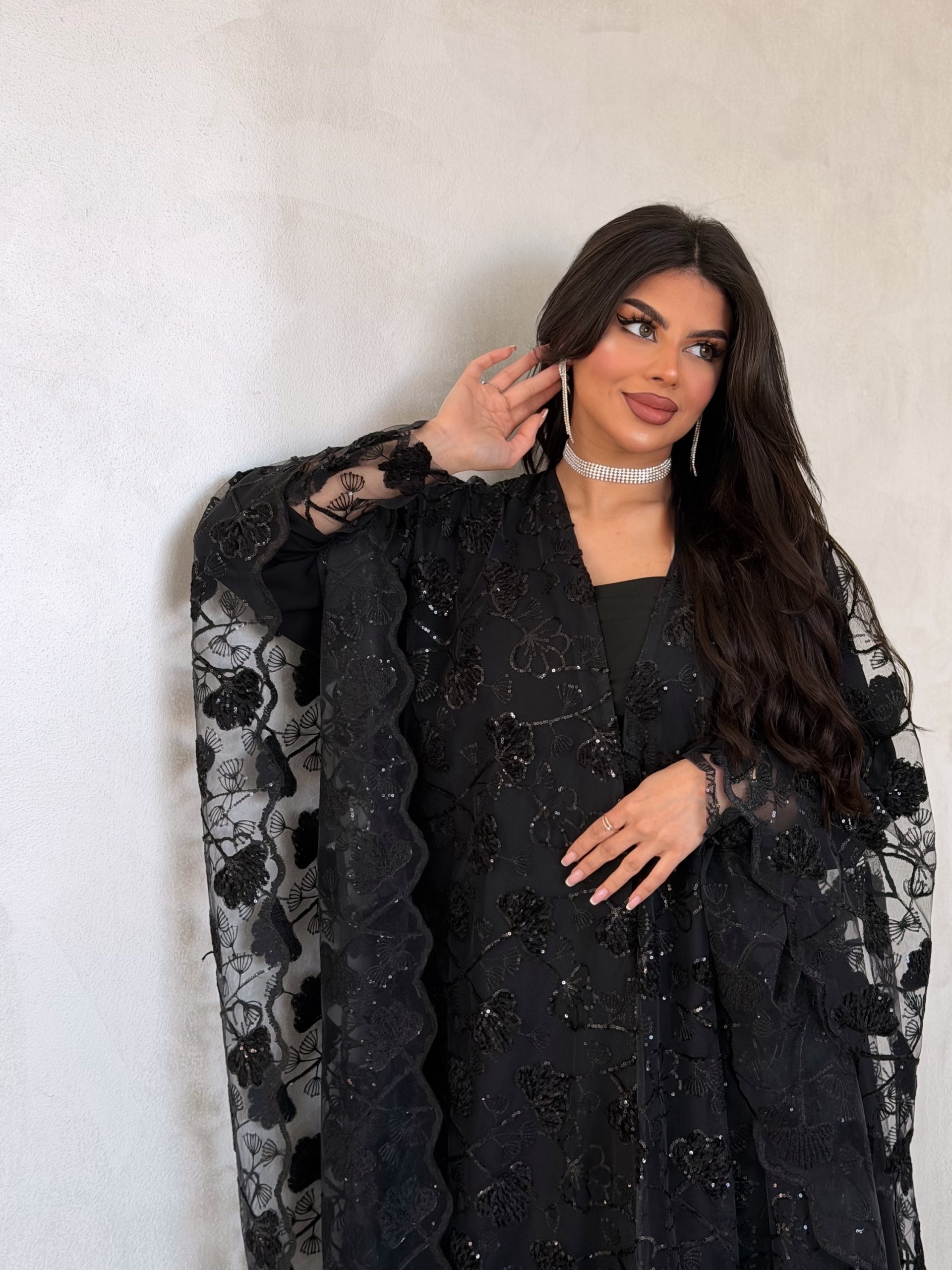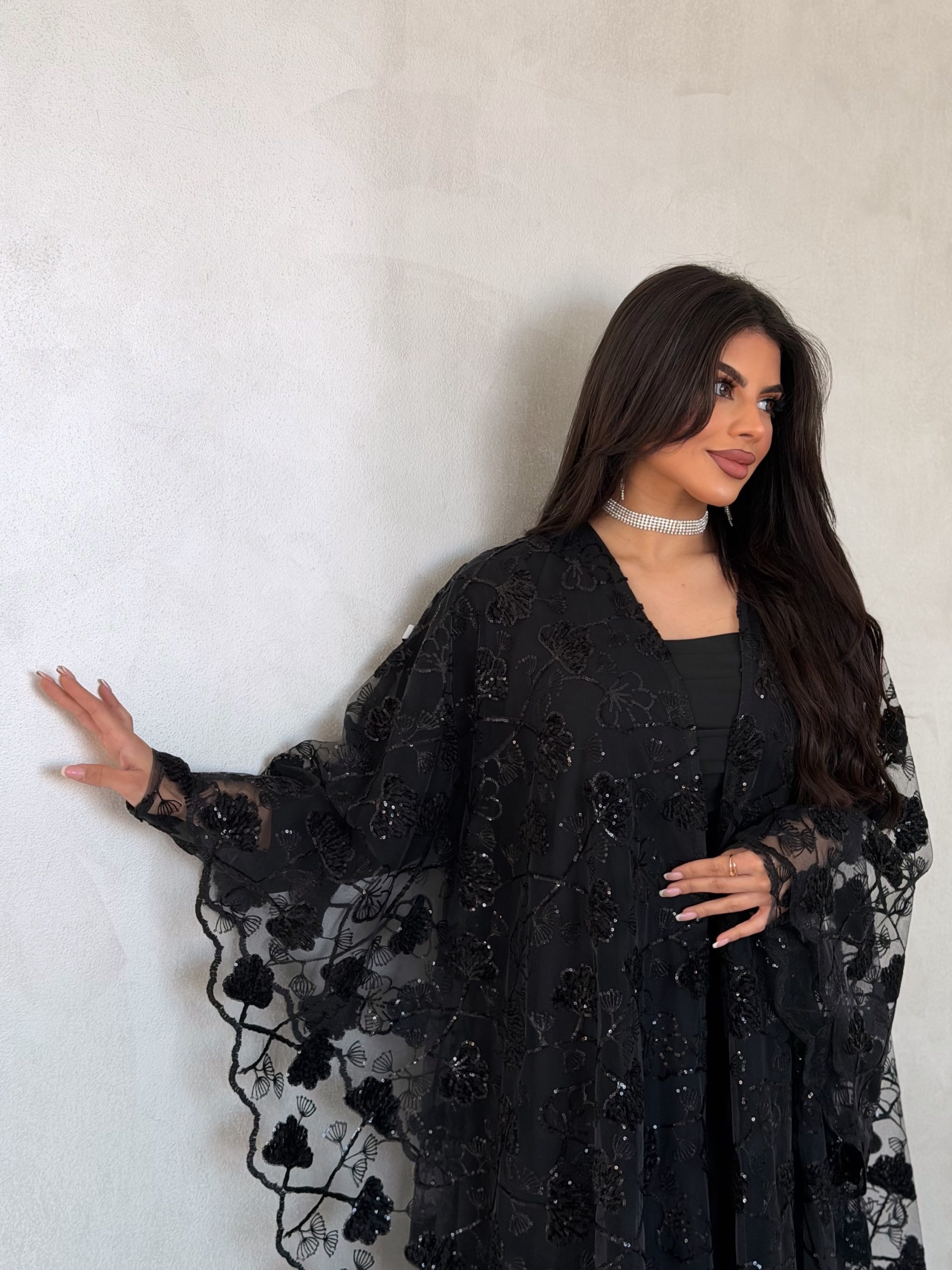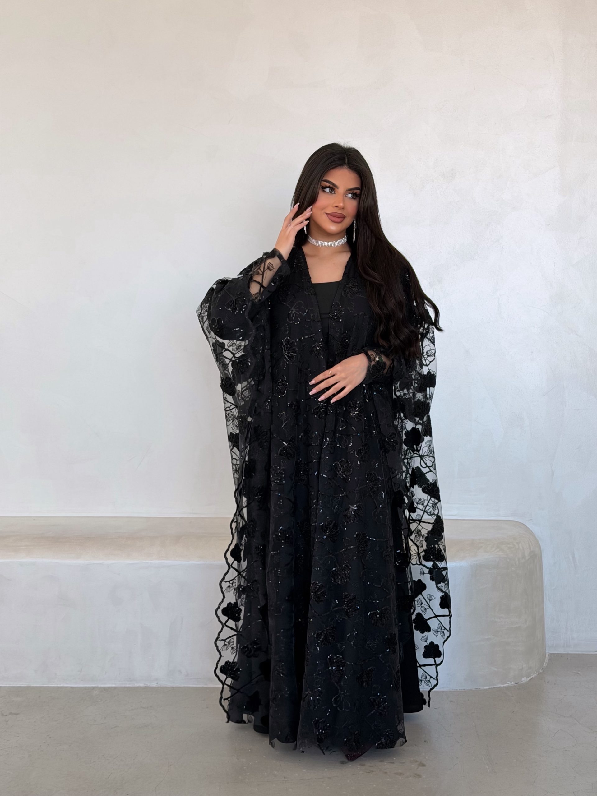 عباية فخمة بفتحة اكمام مقوسة من الاطراف بالدانتيل والشك
