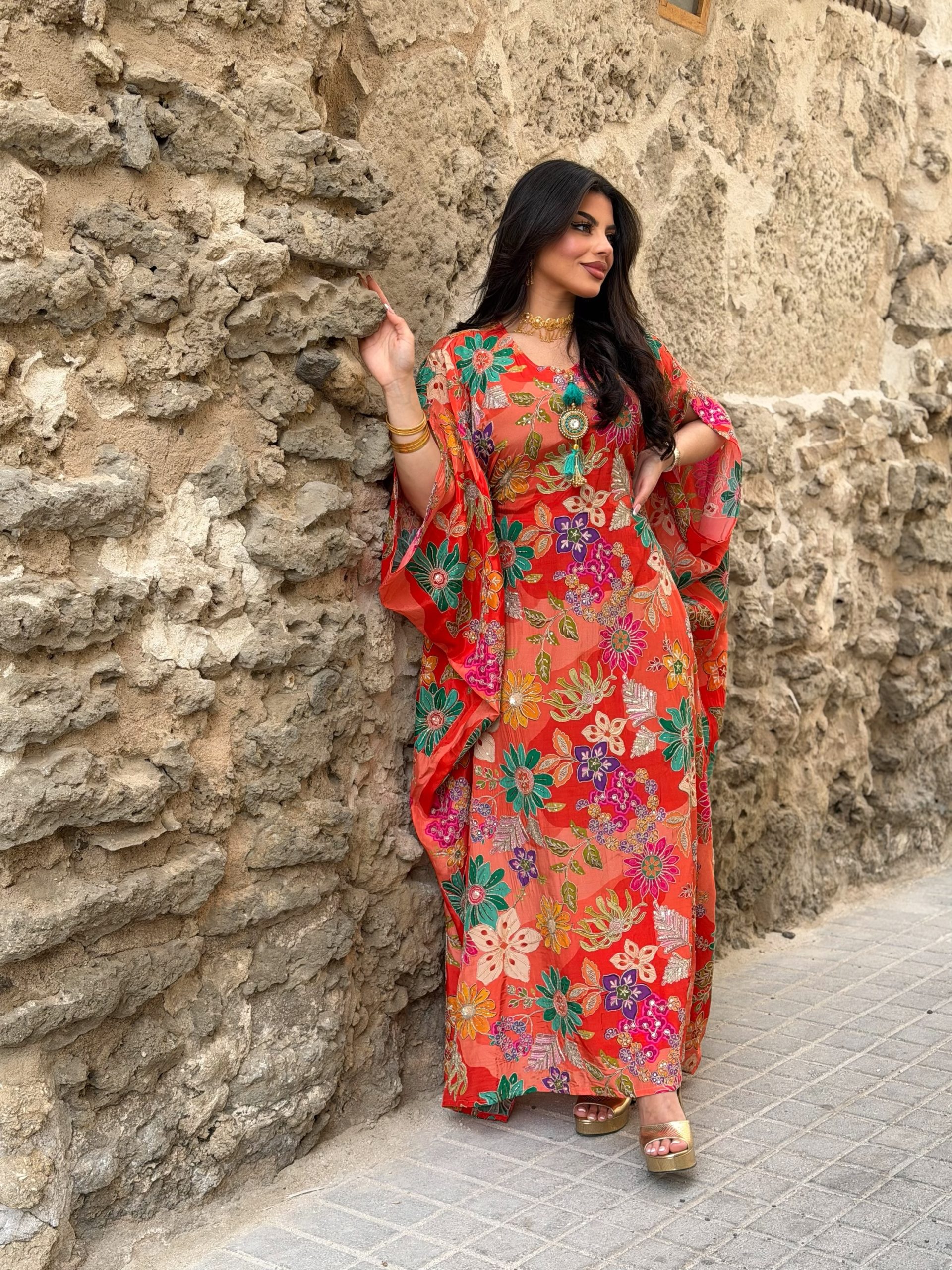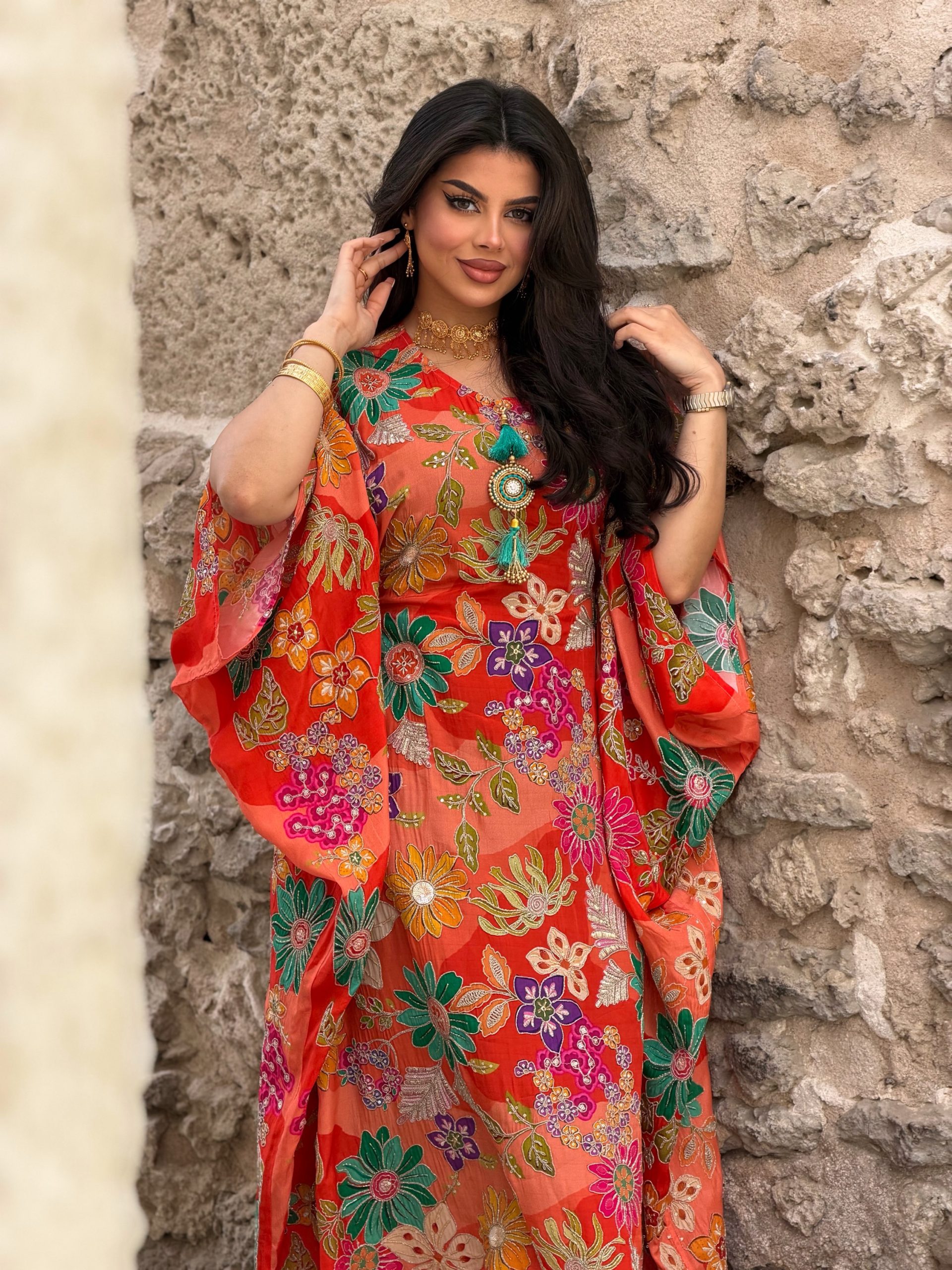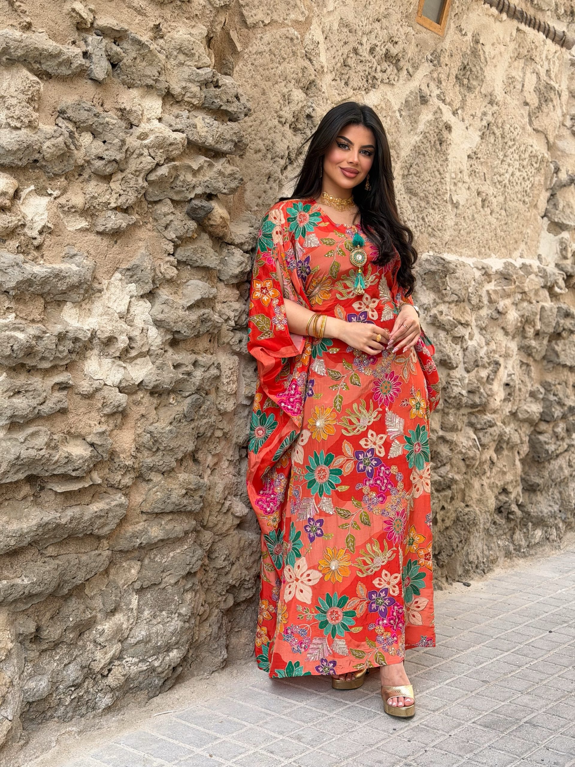 جلابية باللون البرتقالي برسمة فاخرة مع تدخيلة الوان مميزة
