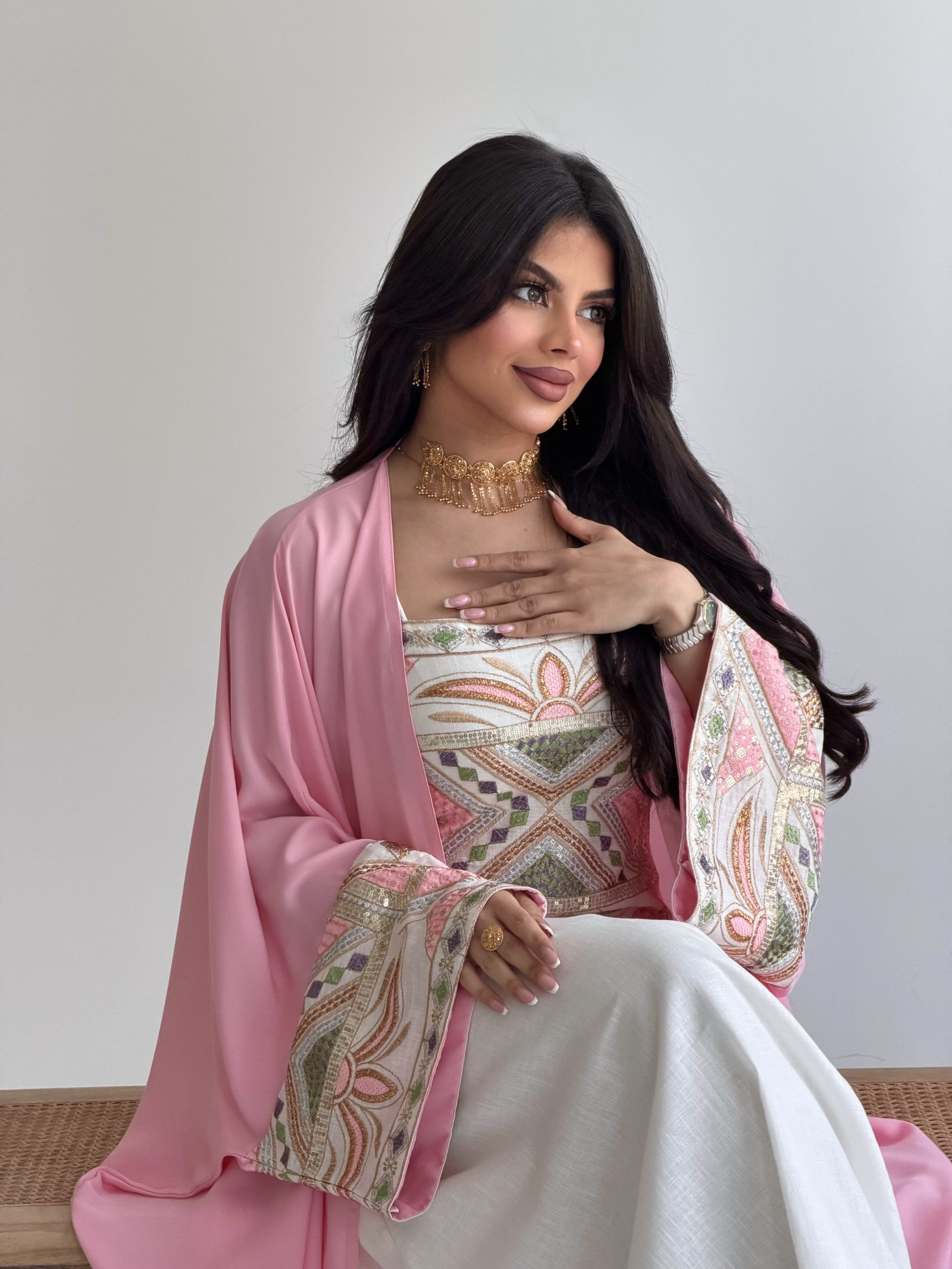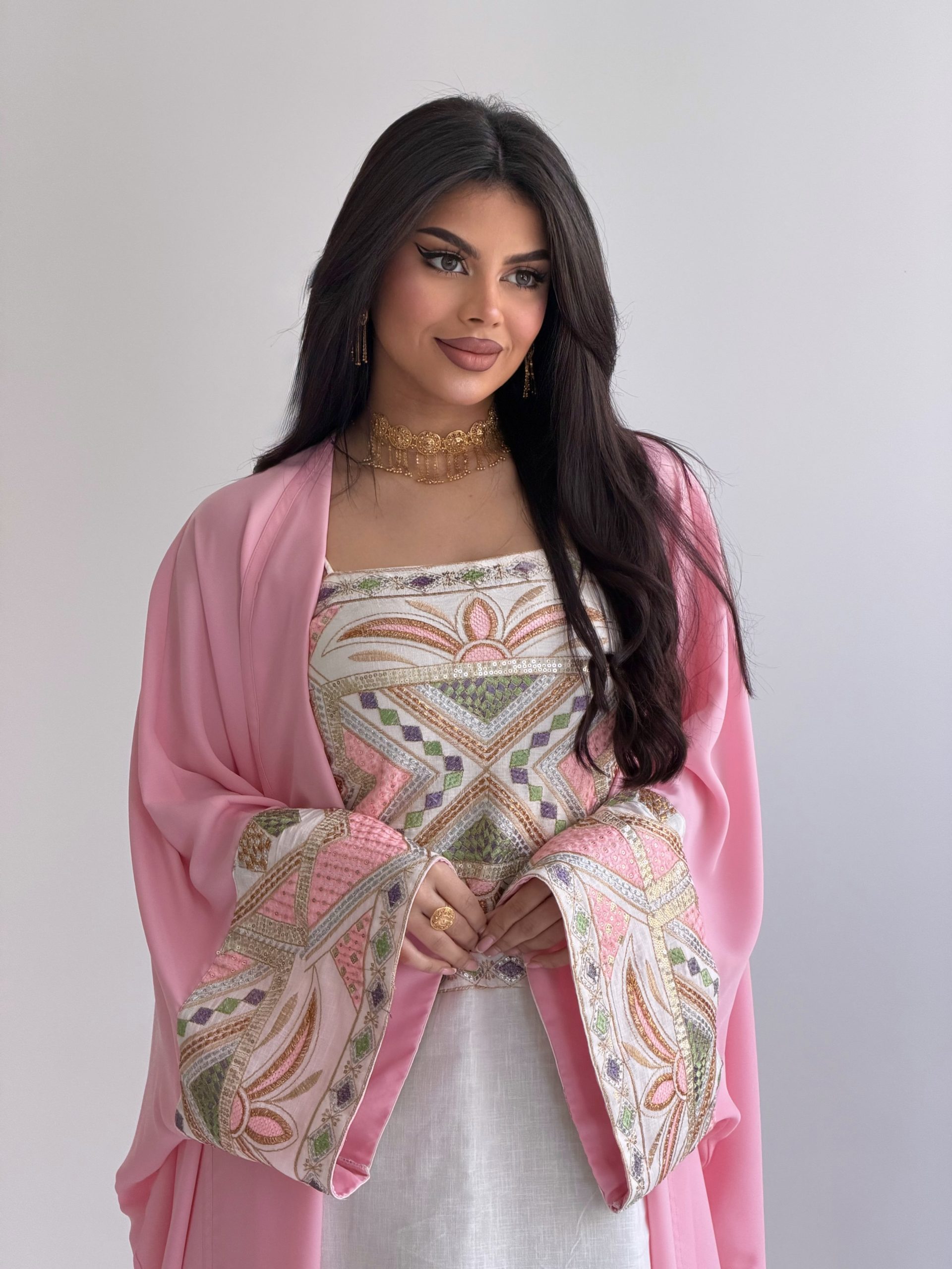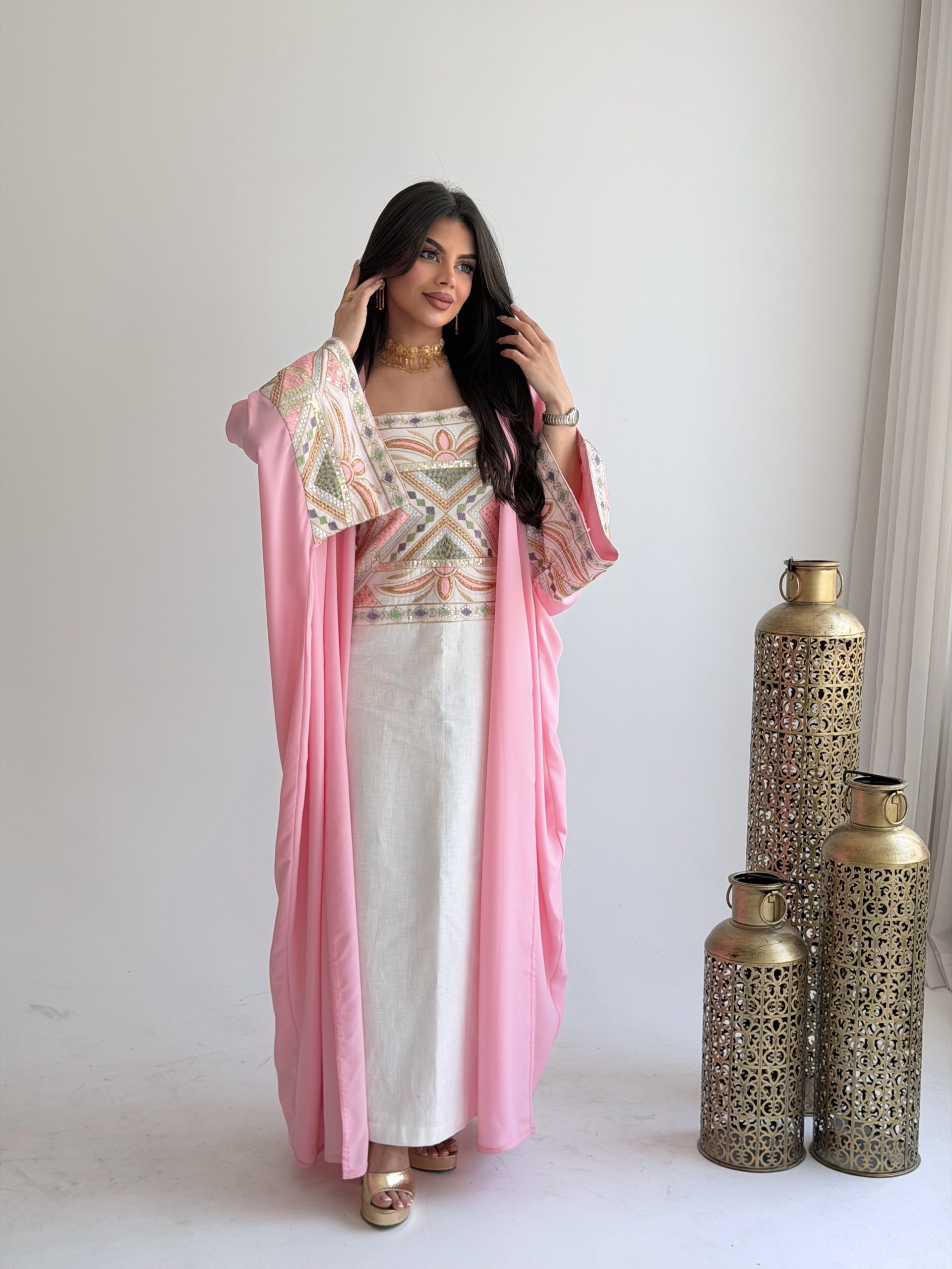 جلابية باللون الوردي والأبيض مطرزة برسمة فاخرة (الرسمة على حسب القماش)