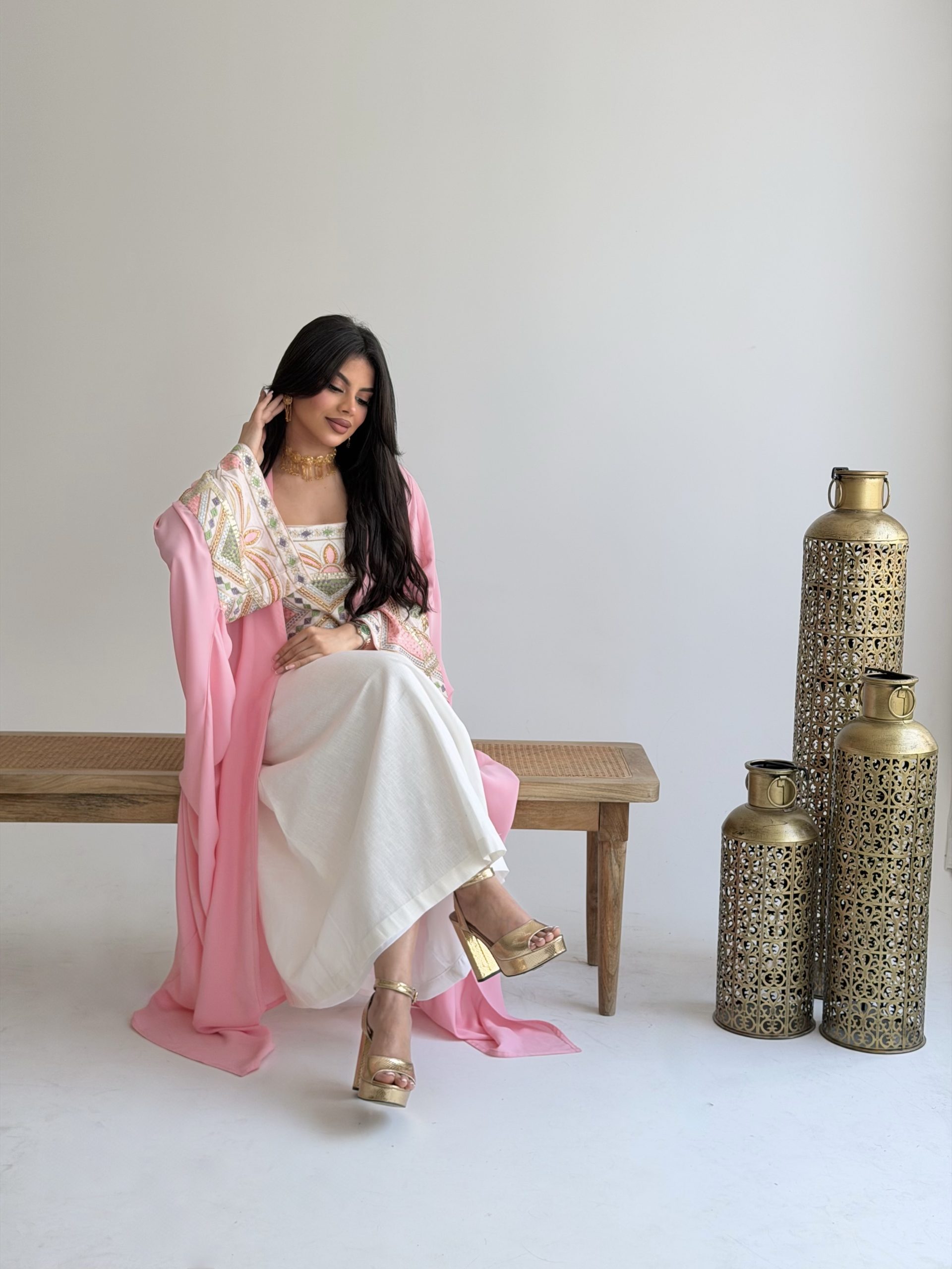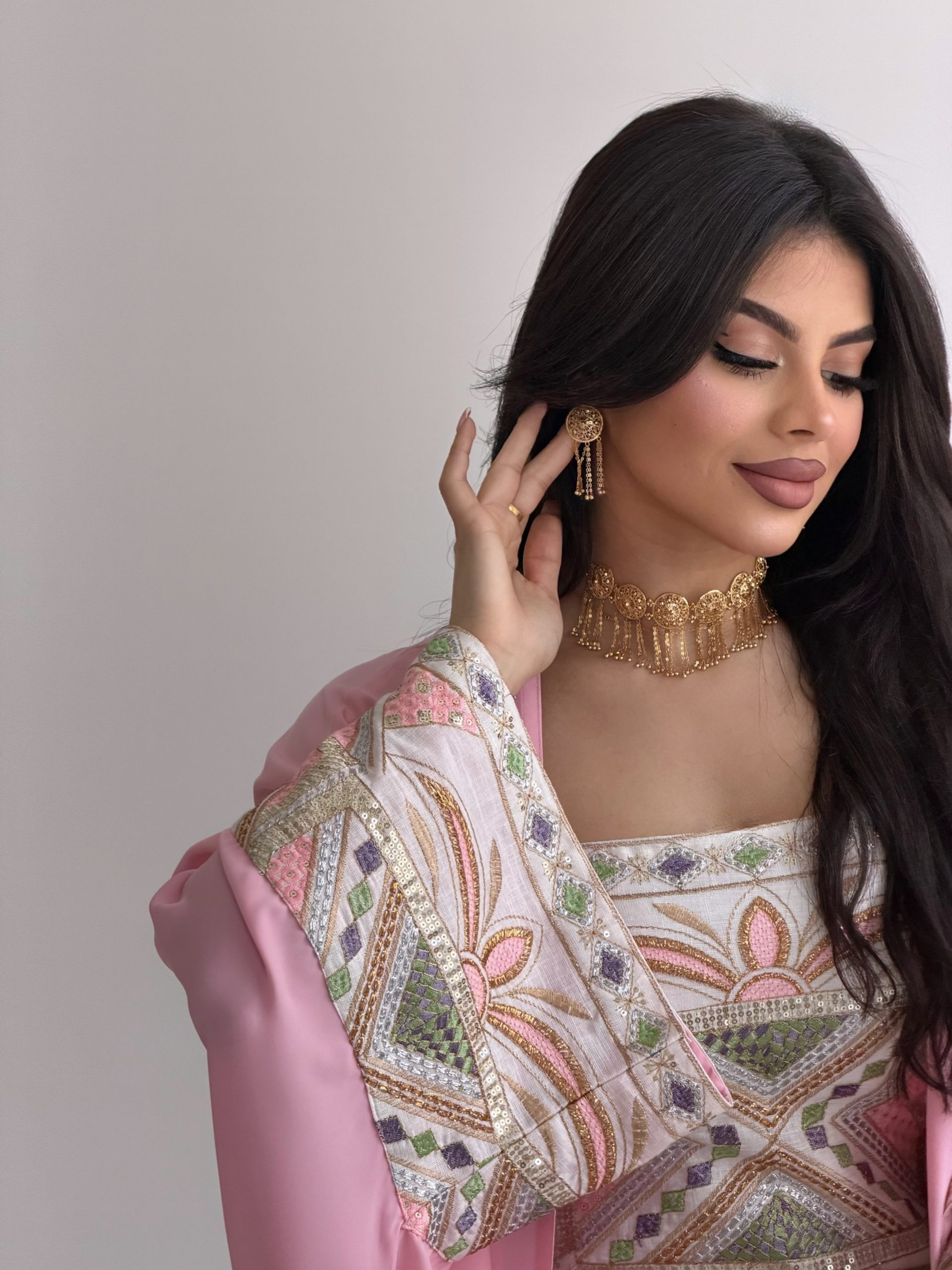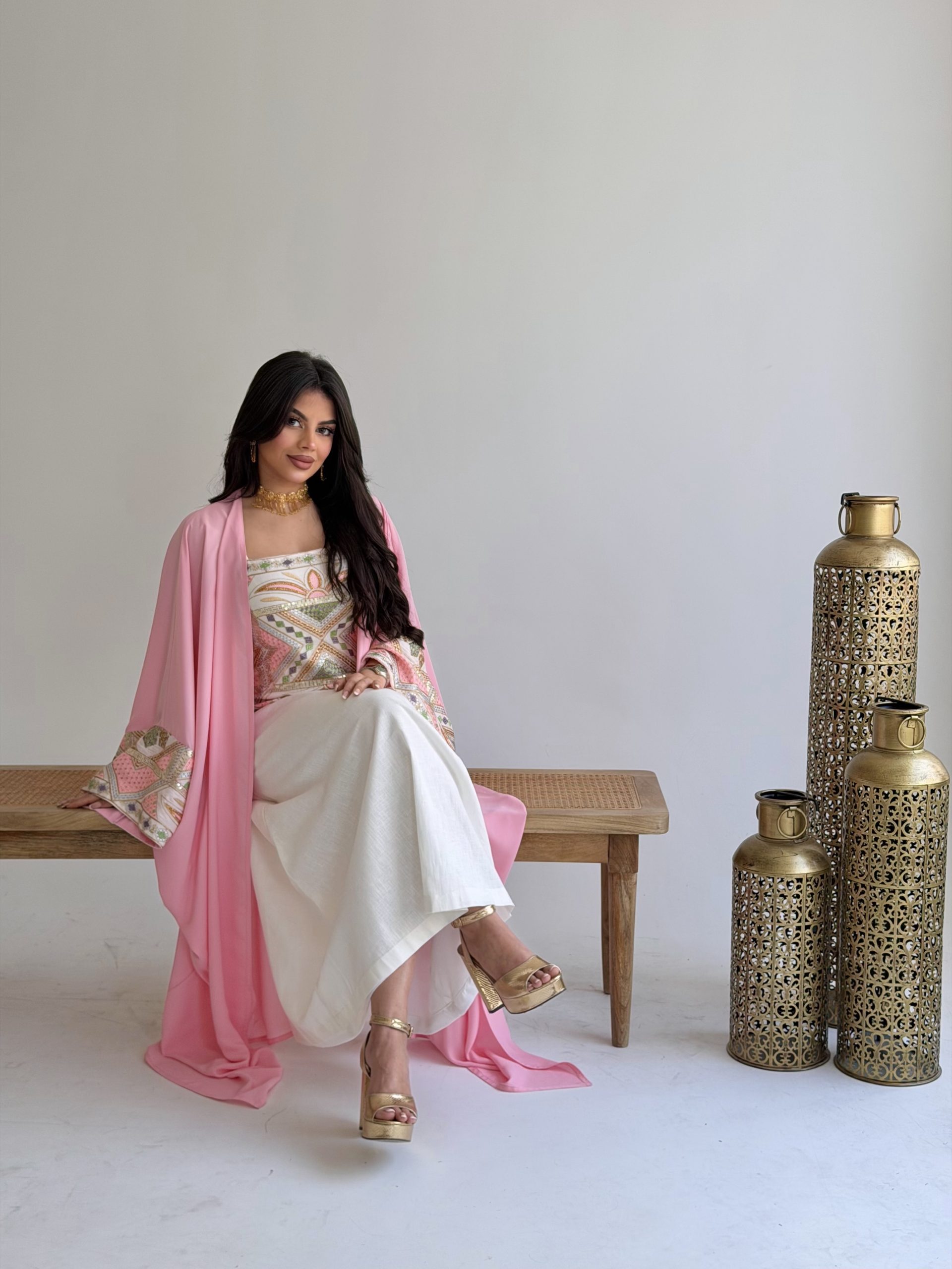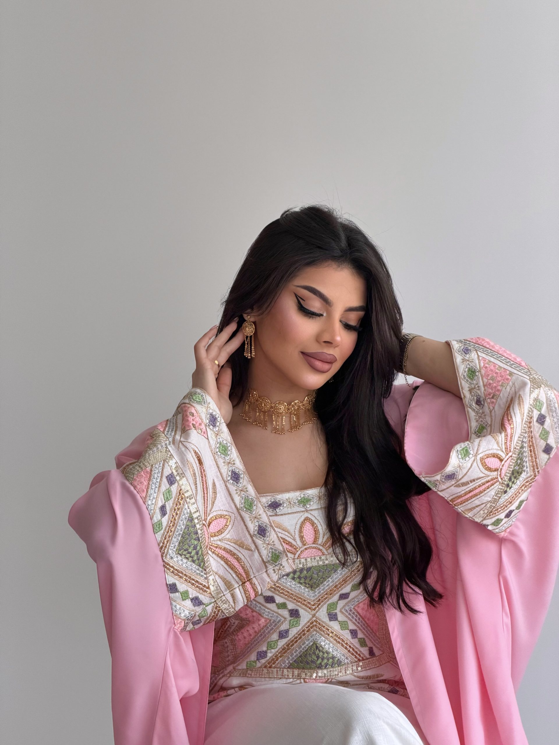 جلابية باللون الوردي والأبيض مطرزة برسمة فاخرة (الرسمة على حسب القماش)