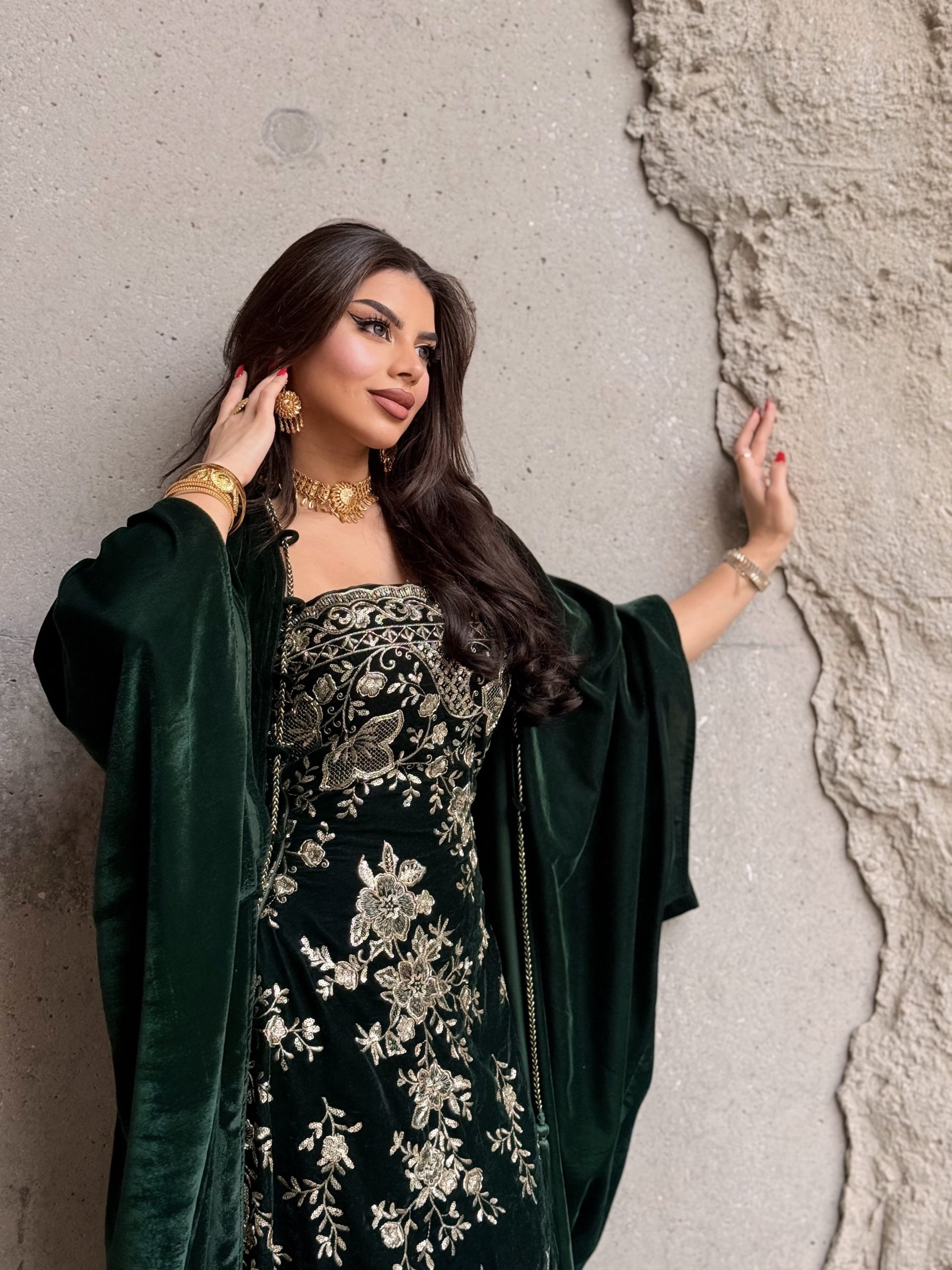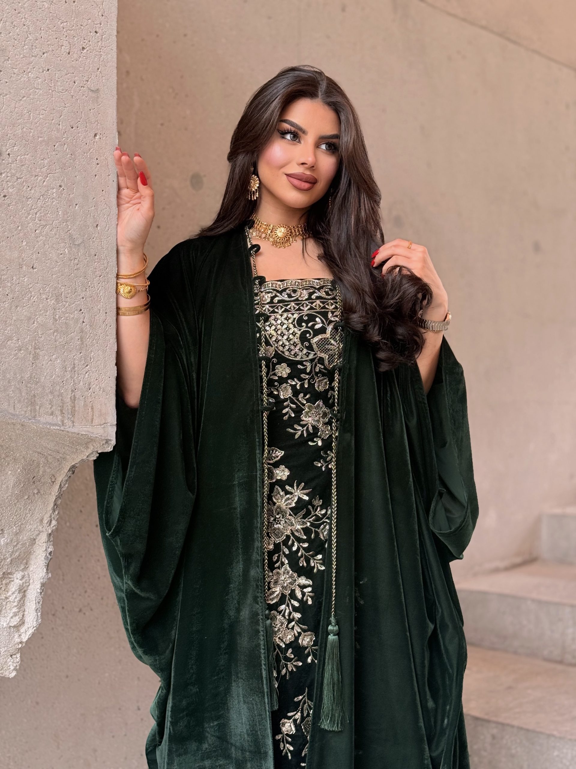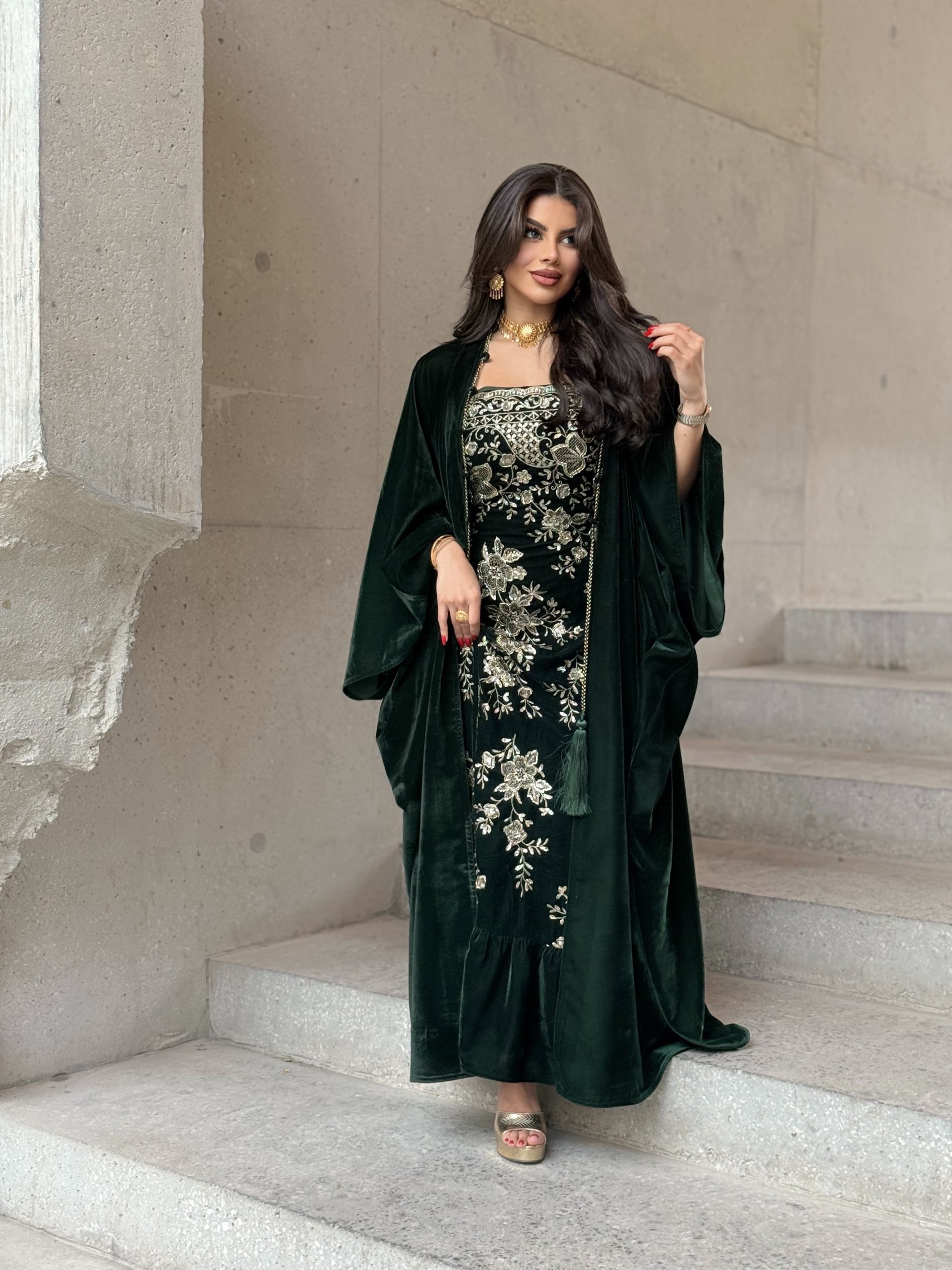 جلابية باللون الأخضر الملكي مكونة من قطعتين العباية و الفستان الداخلي