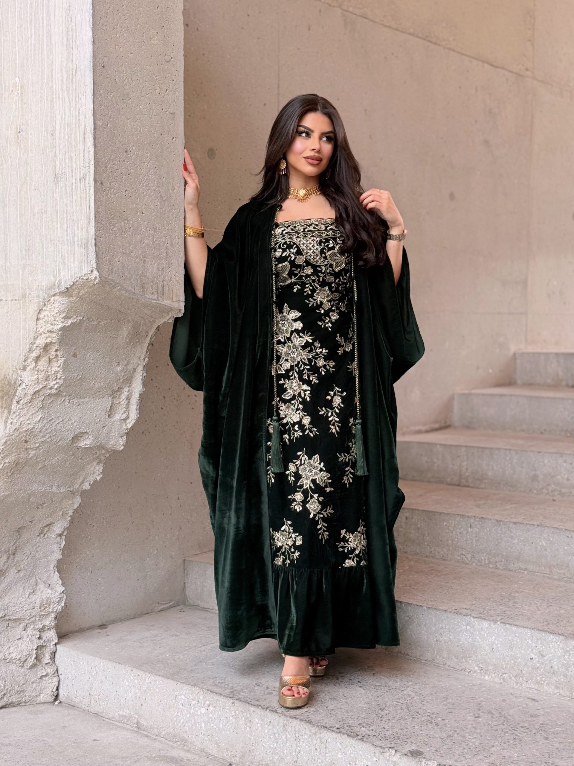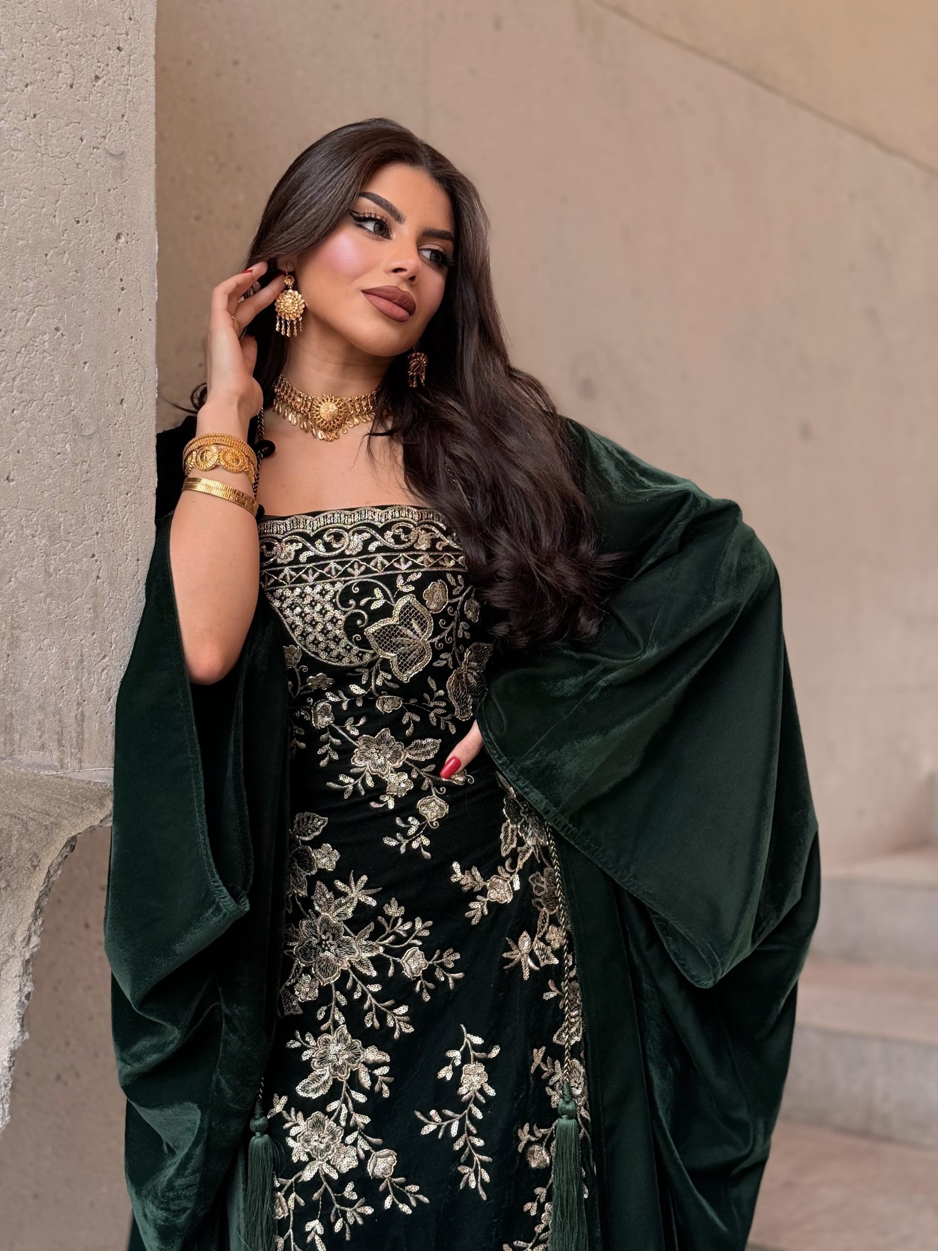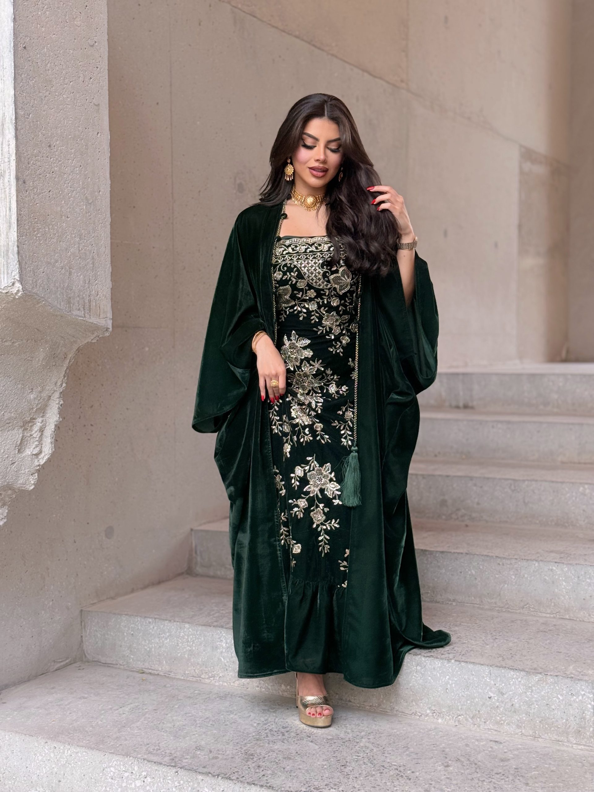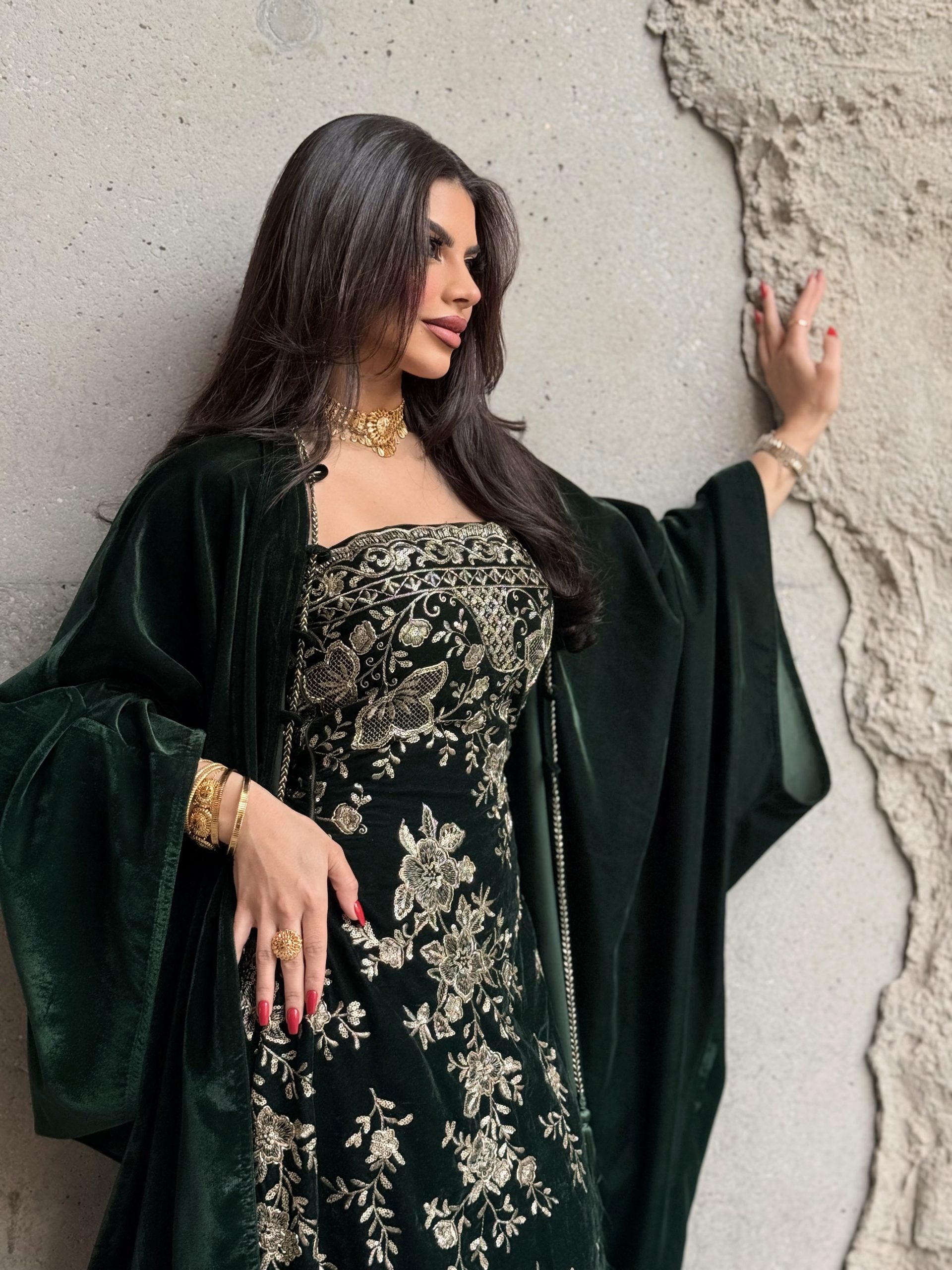 جلابية باللون الأخضر الملكي مكونة من قطعتين العباية و الفستان الداخلي