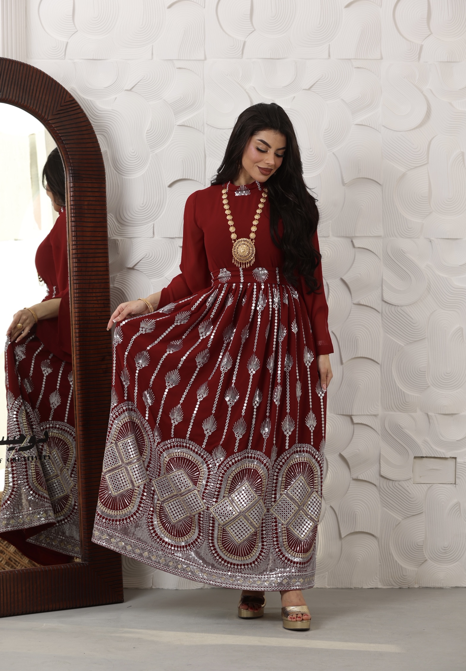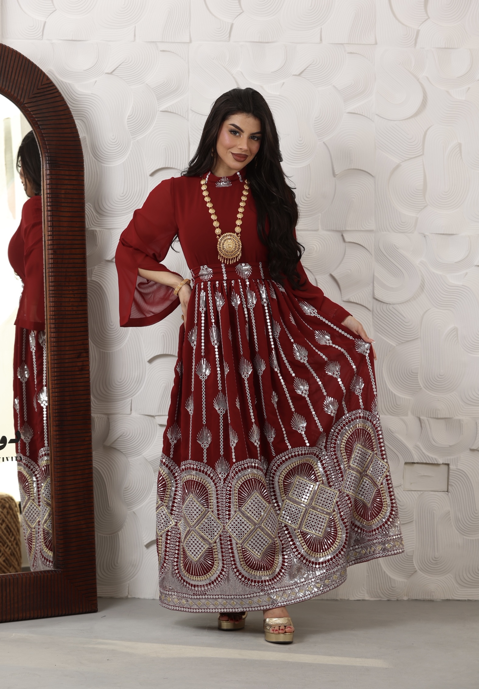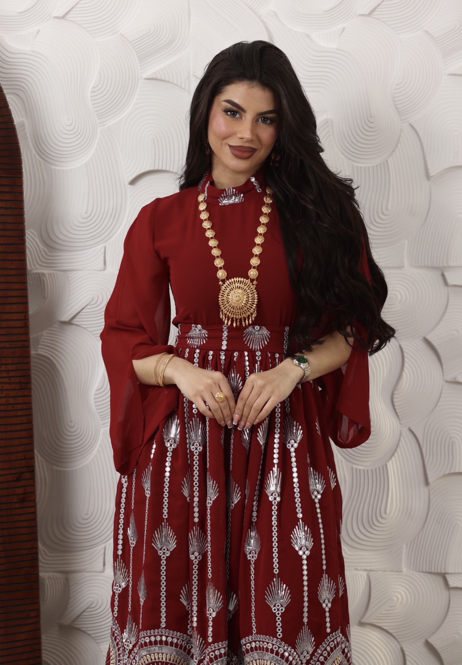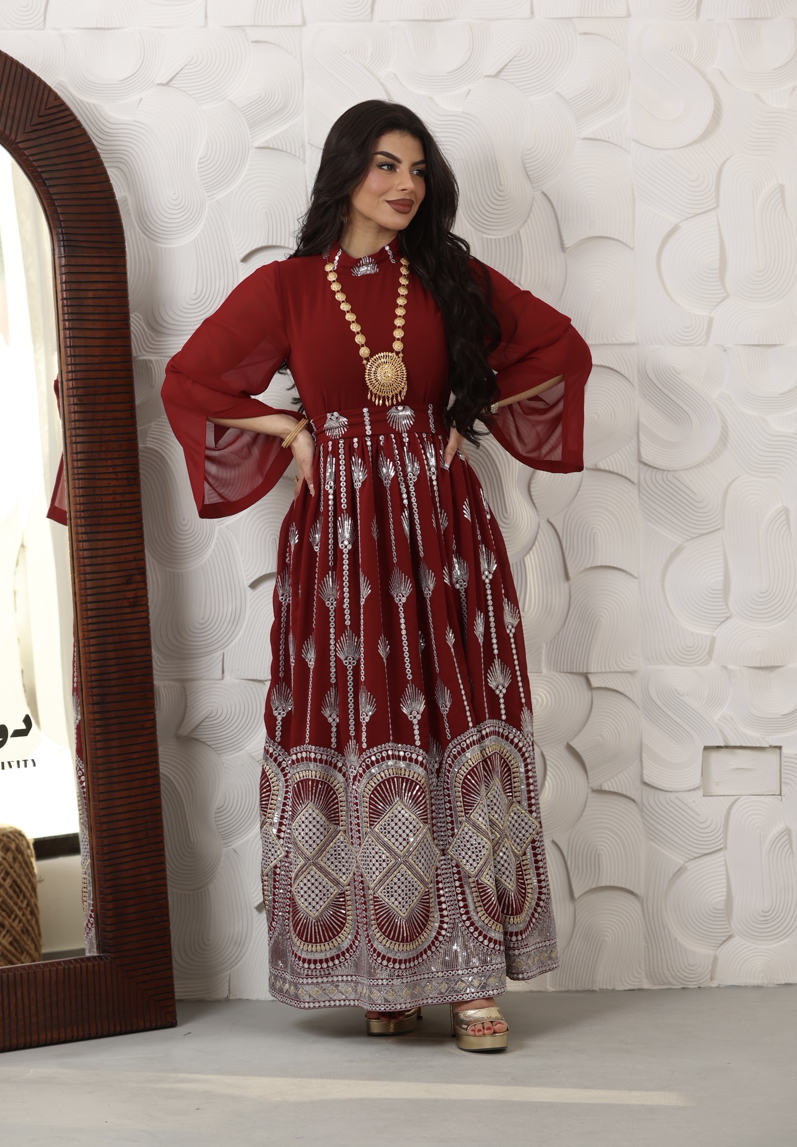 جلابية باللون الأحمر الملكي مع حزام مطرزة برسمة فاخرة